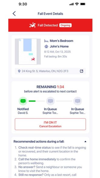 If no one in the Care Tree responds within a defined time, the system automatically escalates the alert to professional support—ensuring help is never missed.